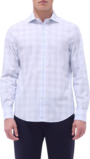 Windowpane checks add refined style to a stretch-cotton sport shirt cut for a modern, shaped fit that looks good tucked or untucked.