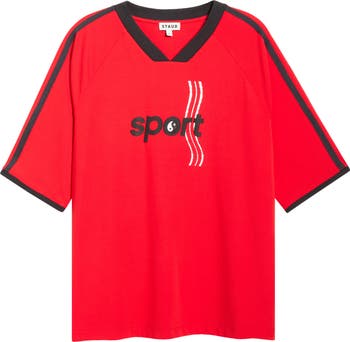Athletic-inspired and bold, this graphic top features a jersey-style silhouette with a high V-neckline. Wide elbow-length sleeves and contrast stripes down the arms amplify the dynamic look, while a sporty front graphic seals the statement.