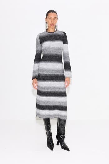 Crew neck long sleeve midi length dress in a custom SIMON MILLER distorted stripe printed ribbed knit.