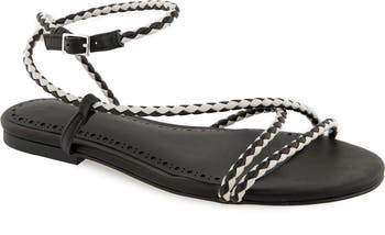 Woven leather straps in two tones shape the intriguing silhouette of this ankle-strap sandal ready for sunny days of exploring.