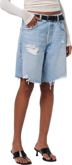 The shape of denim day is changing, and these ripped nonstretch shorts switch things up with a baggy fit and frayed hems that end around the knee.