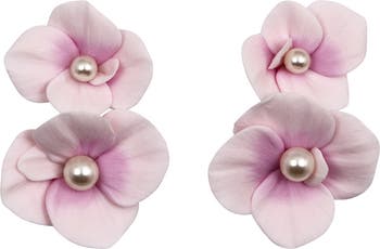 Faux pearls center sculpted clay flowers in these dreamy drop earrings.