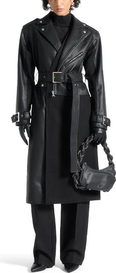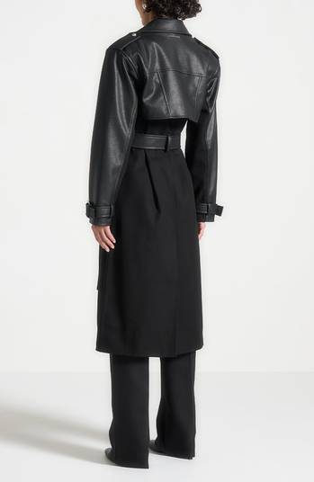 A modern interpretation of a classic, this trench coat redefines outerwear with contrasting textures and elevated details. The sleek blend of vegan leather and cotton creates a striking interplay of structure and softness, while classic lapels and a bold leather storm flap refine the silhouette with tailored edge. Contrasting fabric accents enhance depth and definition, and the adjustable buckle belt cinches the waist for versatile styling and a personalised fit.