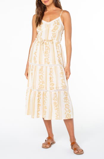 Beachy stripes and island flora take you straight to the tropics in this tiered cotton midi dress winked with pretty floral eyelet.