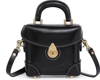 A square genuine leather crossbody with a push lock closure and ergonomic top handle. Its wide opening and stitched details create a vintage inspired look with modern practicality.