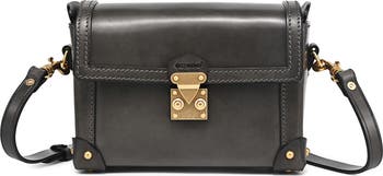 A cubed genuine leather crossbody designed like a mini trunk with a secure flap closure. Hand stitched details and corner patches provide durability and timeless style.