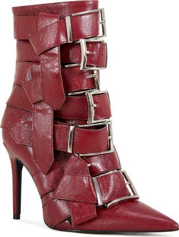 Buckle straps emphasize the modern moto attitude of a pointy-toe bootie lifted by a stiletto heel.