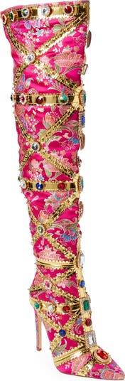 Sparkling crystals and goldtone accents overlay the vibrant floral jacquard of a knee-high boot that definitely delivers on maximalist glamour.