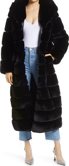 Always-welcome pockets detail the sides of a decadently soft faux-fur coat flaunting a chic longline silhouette for extra warmth.
