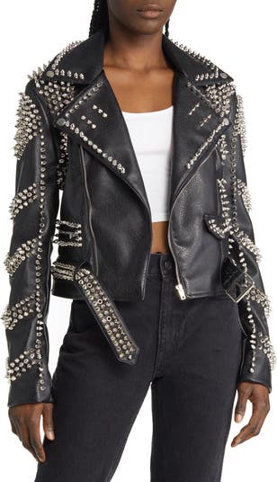 Chevron-patterned spikes on the sleeves lead the charge in this statement-making belted moto jacket with an asymmetric zipper.