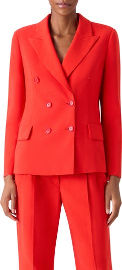 Expertly tailored for professional polish, this wool double-breasted jacket is crafted with sharp peaked lapels and cast in a striking vermilion red.
