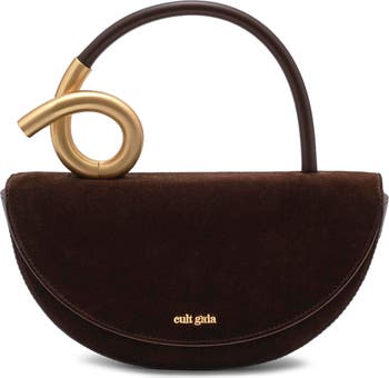 Sculptural golden hardware and a half-moon silhouette lend visual intrigue to a smooth leather bag that adds a statement-making touch to any ensemble.