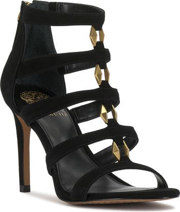 Geometric hardware shines brightly along the caged silhouette of a stiletto-lofted sandal crafted from smooth leather.