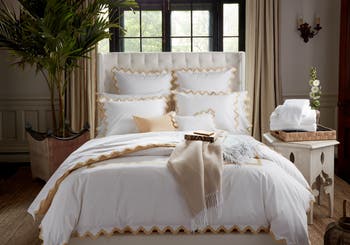 Drawing inspiration from the breathtaking geometry of Moroccan tiles, this fresh cotton-percale sheet is trimmed with a boldly contrasting zigzag appliquè cut from the brand's Nocturne sateen.