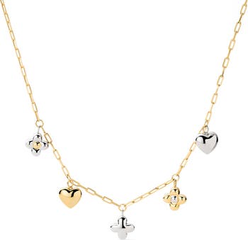 Puffy heart and flower charms dangle from the mixed-metal necklace that elevates the classic charm look.