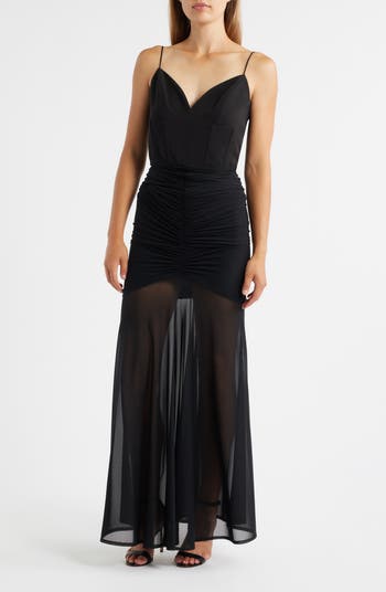 This ruched gown is all about understated glamour with its corseted bodice, flowing sheer hem and drop-waist silhouette that turns heads effortlessly.