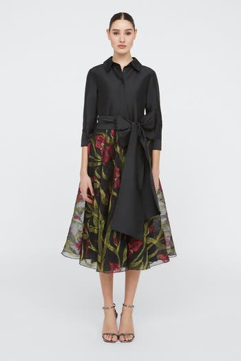 Button down taffeta shirt dress with embroidered pebble organza a line skirt.