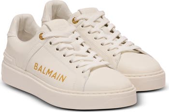 B-Court printed calfskin trainers Lace fastening with engraved eyelets Leather label with contrasting Balmain Paris logo B logo-embossed leather heel counter Visible stitching Thick rubber outsole with raised Balmain logo Leather lining and insole Main material: 100% calfskin Made in Italy Item: GN1VI690LSBG