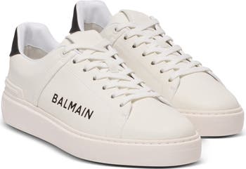 B-Court trainers in calfskin Lace fastening with engraved eyelets Leather label with contrasting Balmain Paris logo B logo-embossed leather heel counter Visible stitching Thick rubber outsole with raised Balmain logo Leather lining and insole Main material: 100% calfskin Made in Italy Item: GM1VI288LSBG