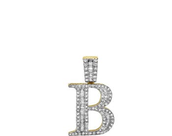 This B initial pendant is crafted in 10K Yellow Gold and features 0.75 carats of G SI1 diamonds. It includes a mix of natural round and baguette diamonds that add dimension texture and brilliance to the design. With expert craftsmanship and an elegant profile this pendant brings a personal and refined touch to any look. CHAIN NOT INCLUDED.