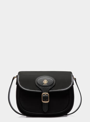 The essential silhouette of this compact B-Light crossbody bag in black nylon fabric is enriched by tonal leather trim. A gold-tone foil Crest signifier sits above the rectangular metal buckle to the front.