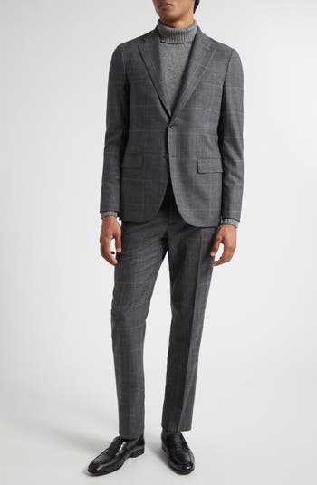 This Italian-crafted suit exemplifies the Milanese label’s tailoring expertise blending smooth wool with clean lines and classic notched lapels. The subtle windowpane checks transition easily from formal events to elevated everyday moments.