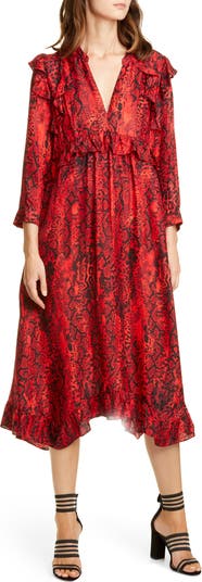 Feminine frill meets desert chic on this airy, ruffle-detailed dress in a vividly colored snakeskin print.