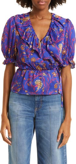Charming puff sleeves frame this flowery satin top designed with a surplice neckline and soft ruffles.