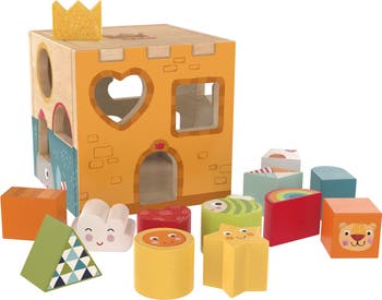 Step into a storybook castle that teaches fine motor skills, color and shape recognition, and problem-solving through playful, Montessori-inspired design. This interactive castle features charming illustrations from the world of Bababoo and friends® and includes 13 vibrantly painted wooden blocks in delightful shapes like a rainbow, heart, sun, and cloud. Toddlers can sort the blocks into matching slots or stack them freely to build towers and scenes, helping to strengthen fine motor skills and teach cause and effect in a playful, educational way. Includes a PlayTales™ card with a unique story and themed activities written by a children’s author. Designed in Europe, the Bababoo Lion Castle Sorting Cube from Bababoo and friends® is a high-quality educational toy for 12 months and up, crafted from durable wood for heirloom-worthy play.