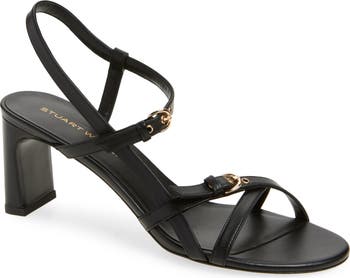 Asymmetric straps saunter over an edgy leather sandal lifted by a modest demi heel and featuring adjustable buckles that offer the perfect fit.