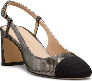 A grosgrain cap toe and lustrous metallic upper create textural interplay on a Spanish-made pump lifted by a modest demi heel and secured with an adjustable slingback strap.