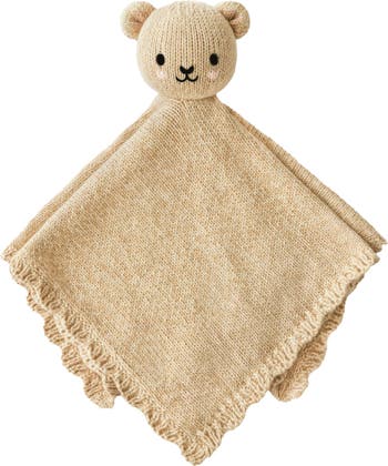 Hand knit from soft Peruvian cotton and stuffed with hypoallergenic polyfill, this plush baby bear blanket is perfect for helping soothe your little one while providing cozy warmth.