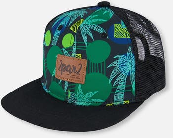 Shield little eyes from the sun with our Printed Cap Green Jungle on Black. This classic baseball cap features a paneled crown, a flat bill, and a logo patch on the front. An allover palm tree and jungle print makes it easy to coordinate with his favorite rashguards and swim shorts!