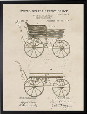 This vintage-inspired print, framed in a black wooden frame, features a baby carriage patent. Sized at 16 inches by 20 inches, this made in the USA frame makes for a beautiful addition to any wall.