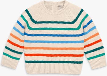 A sweater featuring our brightest rainbow that absolutely qualifies as dressed-up enough. And unlike most sweaters in the world, ours loves the washing machine. Made from 100% cotton that is dreamy soft with layer-friendly warmth, thanks to its slightly chunky knit. Includes back neck snaps for easy on-and-off over big baby heads.