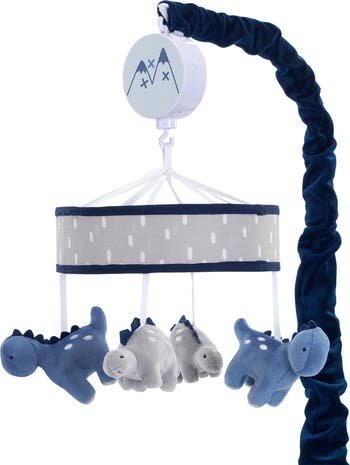 - Hanging baby blue and steel gray velour animal dinos rotate around the musical crib mobile under a wide banded ring to provide entertainment and soothe babies to sleep.