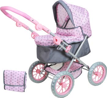 BABY DOLL PRAM: PINK & POLKA DOTS - Take your favorite doll or stuffed animal for a stroll in style with the adorable Lissi Baby Doll Pram in pink and gray with a charming polka dot design! This classic yet compact pram is perfect for little caregivers who love to nurture and play. Thoughtfully designed for both fun and functionality, it features a spacious shopping basket and a matching changing bag—everything your little one needs for a full day of adventures with their doll. The adjustable handlebar extends up to 27”, allowing the pram to grow alongside your child, while the attached rain hood keeps dolls cozy and protected during make-believe rainy walks. Large 7” fixed wheels provide stability and easy maneuvering, making it ideal for younger children. Designed to fit dolls up to 18 inches, it folds flat for quick and convenient storage after playtime. Perfect for encouraging nurturing role-play and imaginative storytelling, this pram helps build empathy, balance, and coordination while providing endless hours of pretend fun. Folded size: 68L x 37W x 22H cm. Recommended for ages 3 and up.