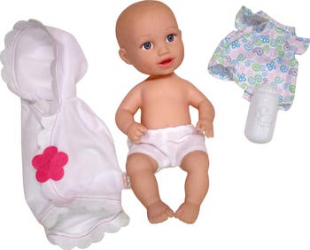 BABY'S FIRST: 13" PLAYFUL BABY - SOFTINA - Our baby bathes with your baby! Our Baby's First Playful Baby Softina doll with a white baby bath blanket is the perfect bathing companion for your or a loved one's child. She features lifelike, ultra-soft skin and is wrapped in an extra-soft, hooded bath blanket adorned with charming flower and scallop designs. Her ensemble includes a stylish patterned jumper, a baby bottle, and a birth certificate, adding to the realistic play experience. Ideal for bath time, playtime, and sleepy time, Playful Baby Softina offers comfort and joy around the clock. Whether for cozy cuddles or imaginative adventures, Playful Baby Softina is the perfect doll for every moment of your child's day! Our product is designed for easy care with a surface-washable feature. Simply use a warm, damp cloth to gently clean and maintain its freshness. Create sweet, life-long memories with our Playful Baby Softina doll. Happy babies, happy moms! Smart Age Rating: Our Hug & Luv undergoes independent testing to ensure it meets the highest safety standards for the appropriate age grade, providing peace of mind for parents and a secure play experience for your child. Perfect for children 2 years and up. INCLUDES: 13" Softina Baby Doll, Baby Bottle, Dress, Birth Certificate, Diaper & Baby Bath Blanket.