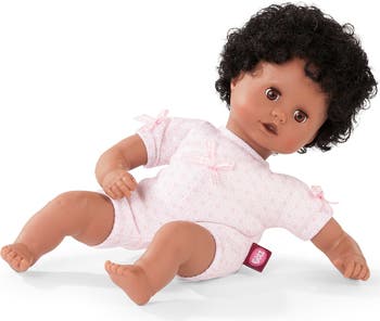 This dark-skinned "Muffin" Gotz baby doll comes naked so you can dress her just as you like. Her frizzy hair needs a little extra care, just regularly comb her with a wire hairbrush. Our Muffins are filled with fluffy material and granules which make them very cuddly (soft bodied doll). Children can easily undress them and put their clothes back on. This Muffin has brown sleeping eyes. For over 60 years, German-designed Gotz dolls have been known for their superior quality and durable craftsmanship, to become a child's favorite playmate. Their endearing faces and expressions speak directly to every doll parent.