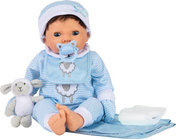 - Comes with bib, mittens, lamb toy, nappy, pacifier and blanket.