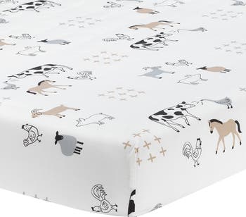 This 100% cotton breathable fitted crib sheet is on a white ground with all the happy farm animals interacting with each other. The barn animals are all neutral colors of white, gray, taupe, and black and include a cow, sheep, rooster, pig, goat, and duck. It's the perfect neutral farm print for any baby. The crib sheet has elastic all the way around ensuring a safe and secure fit on a standard size crib mattress measuring 28” X 52”.