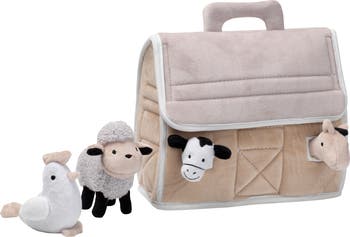 This unique plush farmhouse has two windows, a handle for easy carrying, and includes four friendly farm animals: one gray sheep, one white rooster, one taupe horse, and a black and white cow. The roof is a light gray and there are two windows allowing the animals to peek out. One side of the roof opens and closes, making it easy to access the inside where the animals live. This will surely provide hours of fun for your little one. A wonderful toy for developing visual processing, playing hide and seek, as well as working on fine motor skills. A baby registry favorite and wonderful welcome home baby gift. Spot clean only.