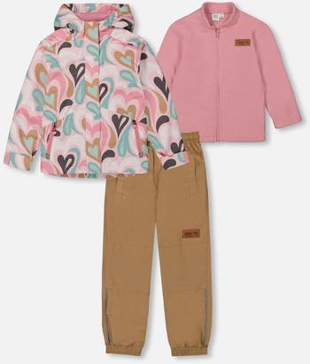 With a bold allover heart print, our 3-in-1 Mid-Season Outerwear Set with Printed Jacket Light Pink and Beige Pant, features three layers that they can wear separately or all together. This waterproof set features an adjustable elastic waist pant, a hooded jacket with zipper pockets, wrist with velcro straps and a solid polar fleece jacket that they can wear alone or layer beneath the coat for added warmth.