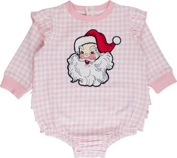 Dear Santa Pink Gingham Applique Sweatshirt Bubble Romper is the perfect festive choice for your little girl this holiday season. Exquisitely designed in a vibrant pink gingham pattern, this girls' applique romper combines style with comfort. Featuring adorable Santa applique details that capture the spirit of the season, this pink bubble romper is a standout in holiday baby romper collections. Ideal for festive gatherings or cozy evenings at home, this soft knit baby romper ensures your baby feels snuggly and comfortable thanks to its stretch fabric. The thoughtful design includes snaps for easy changing, making it as practical as it is pretty. This baby romper with ruffles also boasts full seat coverage and signature rear ruffles, adding a touch of whimsy to each movement. With a focus on both charm and functionality, this baby romper for easy changing is not only a delightful outfit choice but also simplifies dressing routines. It's a fabulous addition to any baby clothing collection, especially for those looking for girls' pink gingham clothing or a toddler gingham romper that merges traditional holiday themes with modern babywear conveniences.