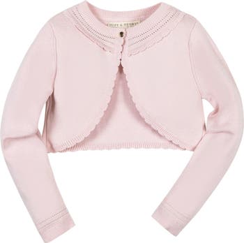 A beautiful layer to top off her dressy outfits. Our cropped cardigan sweater is knit in fine gauge organic cotton with full fashioning at armholes and a pointelle pattern throughout. Features delicate pearlized buttons.