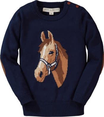 She'll be the epitome of equestrian chic in our adorable intarsia sweater in soft organic cotton. Features faux suede elbow patches, faux leather buttons at the shoulder placket, and a sophisticated horse design that pairs perfectly with our line of leggings and riding pants. A special piece to be worn, loved, and handed down again and again.
