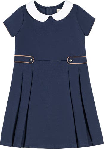 Our special schoolgirl dress combines the comfort of our luxurious organic cotton ponte knit with classic tailored details. Features a peter pan woven collar, a pleated skirt detail for extra volume, faux suede tipping, and decorative waist tabs with gold buttons. A zip closure down the center back makes for easy dressing.