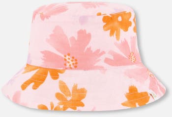 Baby Girl's Printed Muslin Bucket Hat Pink And Coral Flowers