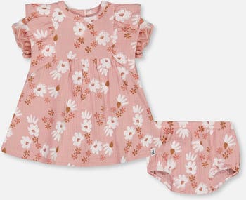 Baby Girl's Printed Muslin Dress And Bloomer Set Pink And White Flowers