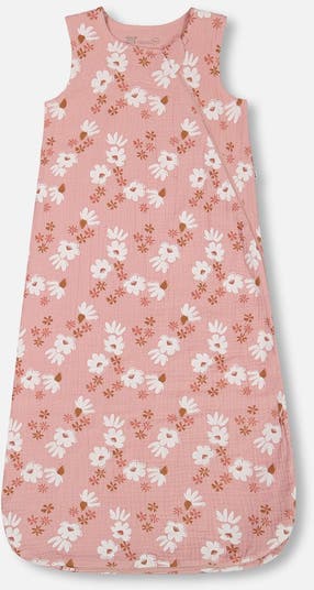 Wrap little ones in comfort and style with our Printed Muslin Sleep Sack Pink and White Flowers. Made from 100% cotton fabric, this allover print sleep sack features a sleeveless silhouette with a round neckline, an asymmetrical zipper closure, and an allover floral print.
